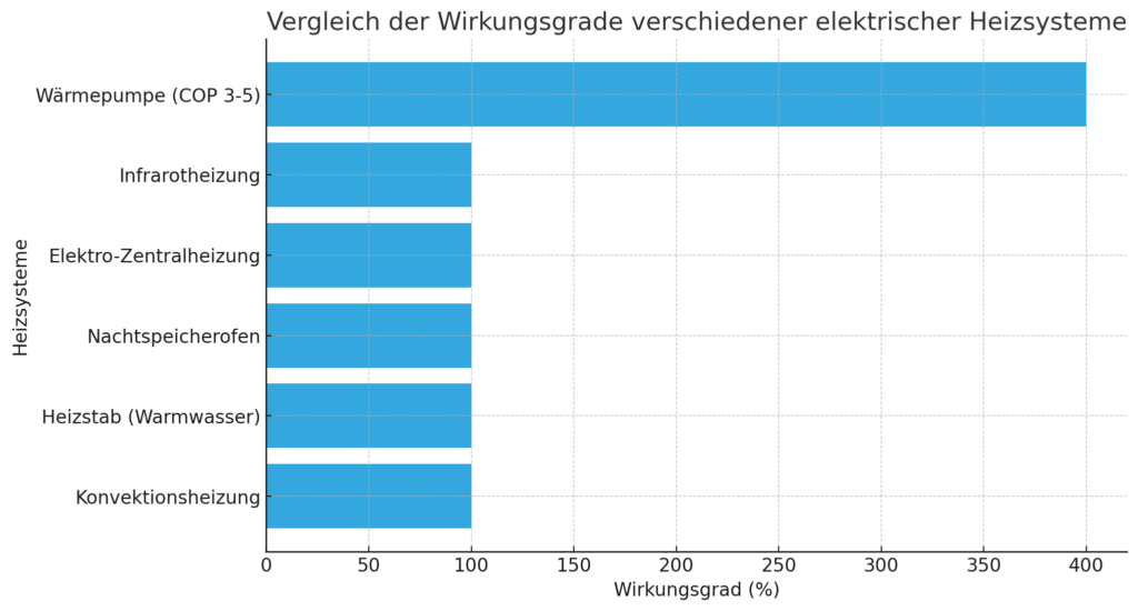 • Wirkungsgrad: 100 % – der gesamte verbrauchte Strom wird in Wärme umgesetzt, jedoch ohne zusätzliche Effizienzgewinne.
